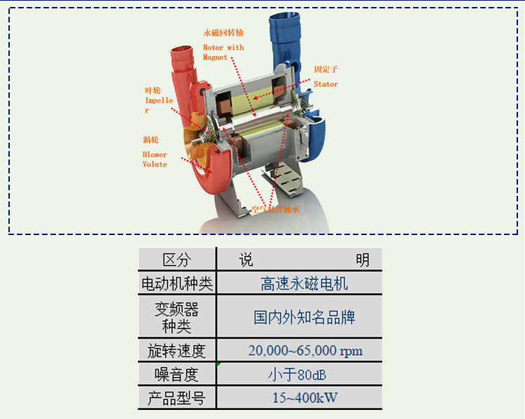 空氣懸浮的核心組件有:不銹鋼蝸殼、空氣懸浮軸承、高速離心葉輪,這幾個(gè)組件組成了風(fēng)機(jī)的核心部分,是鼓風(fēng)機(jī)工作的重點(diǎn)部分。空氣懸浮鼓風(fēng)機(jī)產(chǎn)品頁(yè)
